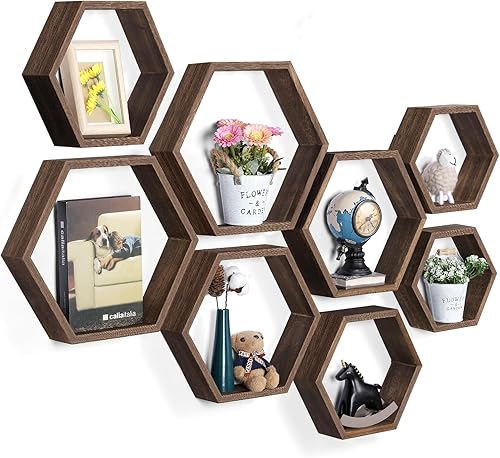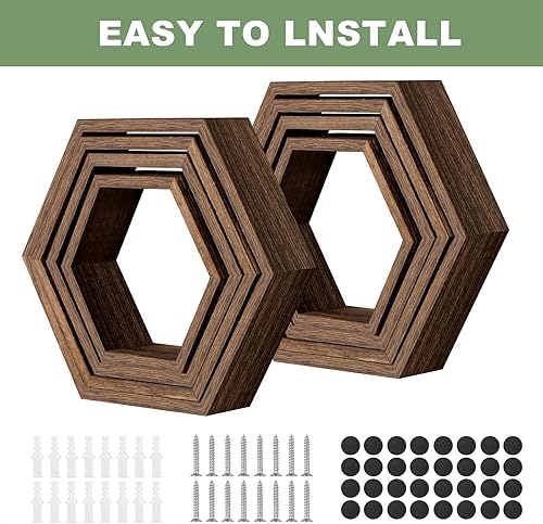 Hexagon Lot de 6 étagères murales en nid d'abeilles en bois pour maisons de ferme, écran en bois, étagères hexagonales, fixées au mur, bureau, décoration marron