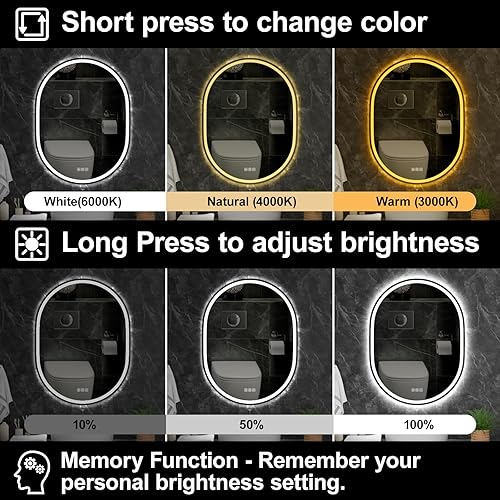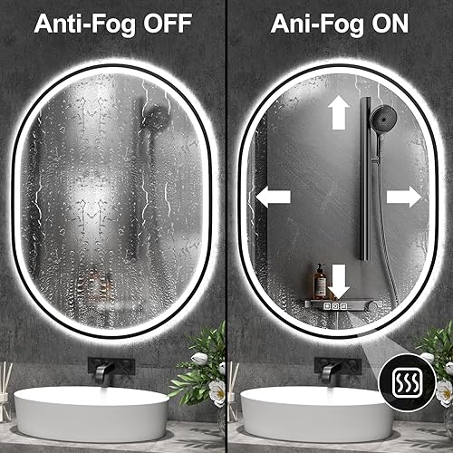 furduzz Miroir de salle de bain ovale à LED avec cadre noir, 500 x 700 mm, miroir de salle de bain éclairé avec touch/désembuage/3 couleurs, à intensité variable, montage mural, horizontal/vertical