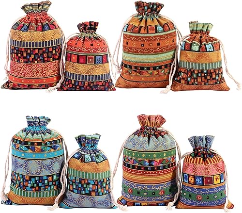 SYEYCW 8 Pièces Pochon Tissu, Sac en Toile de Jute de Style Ethnique Égyptien, Coton de Style Ethnique Cordon Sac Cadeau, Pochettes à Bijoux Respirantes avec Cordon, pour Mariage, Fête, Anniversaire