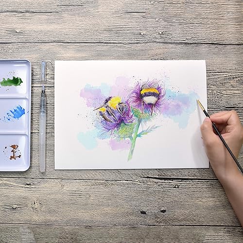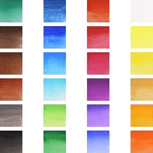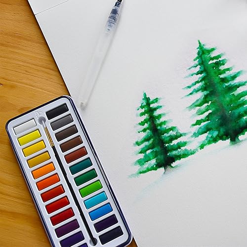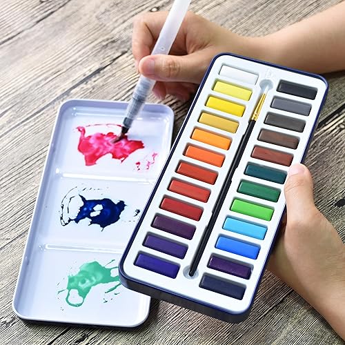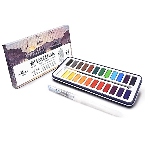 Stationery Island Palette de Peinture Aquarelle Set de peinture à l'aquarelle, 24 couleurs pan+1 pinceau aquatique+1 pinceau+palette de mélange dans une boîte en fer-blanc Ensemble d'art léger et
