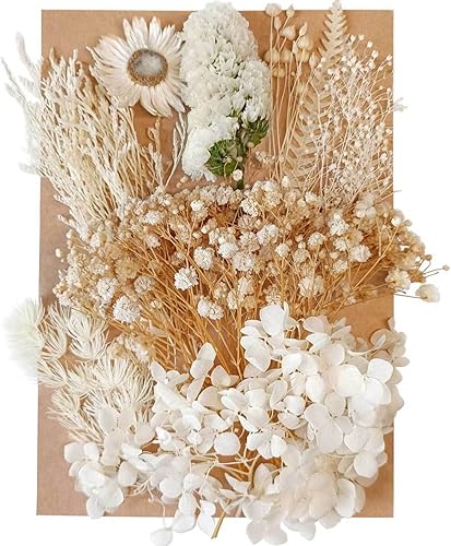Natuce Fleurs Séchées Blanches - Ensemble Naturel de Bouquet Vrai Avec Feuilles Pour Signets, Bijoux, Scrapbooking