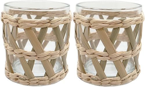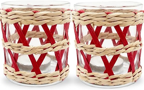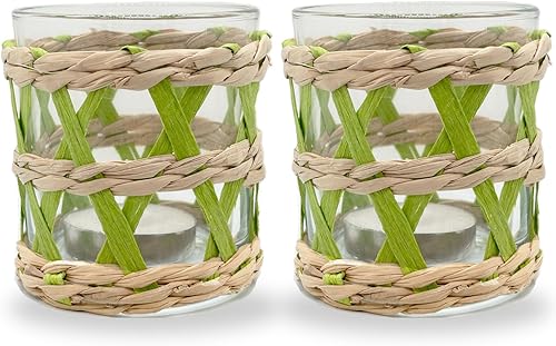 Lot de 2 photophores en rotin tissé – En jonc de mer naturel tissé à la main – Photophore décoratif pour table de salle à manger, cuisine
