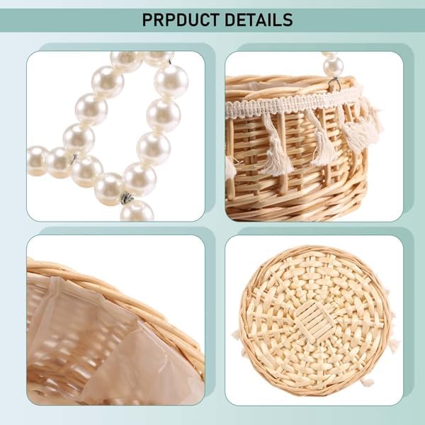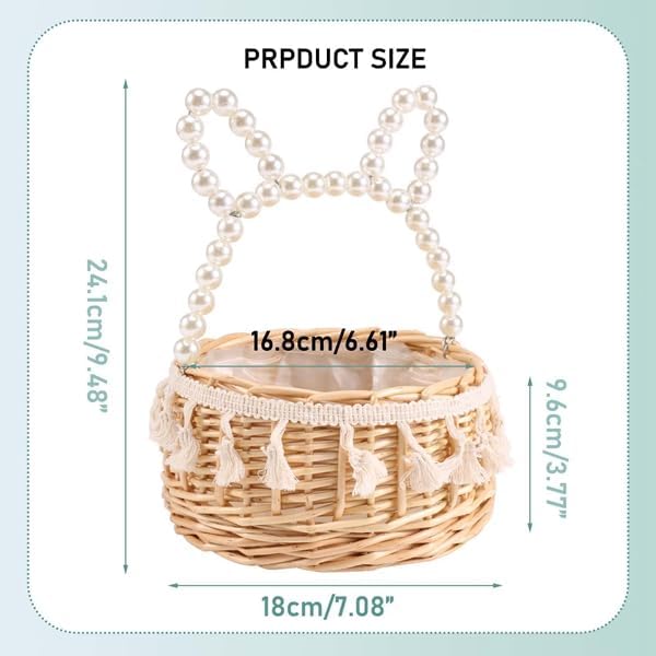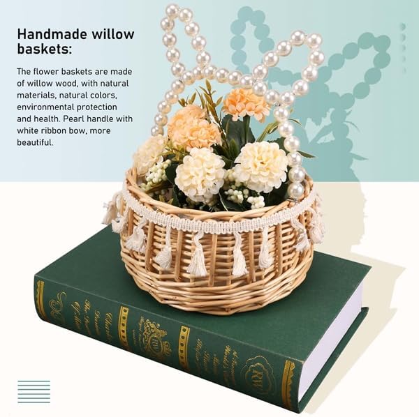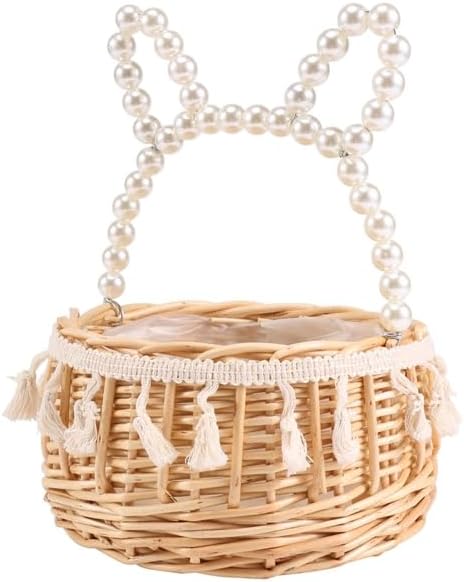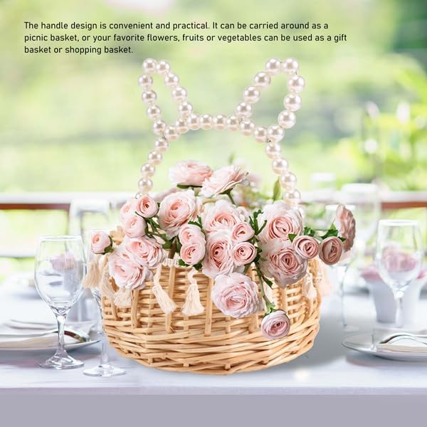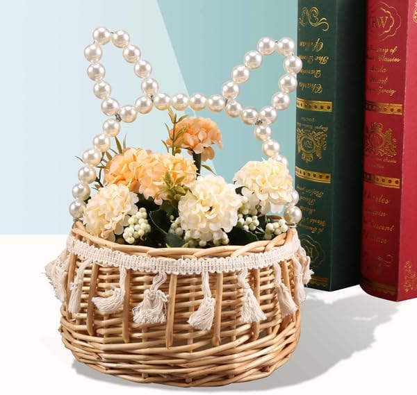 Povxlum Panier de Fleurs, Panier Osier, Panier Pique Nique, Panier de Paques, Panier en Osier Avec Anse, Joli Panier Tissé à la Main en Perles pour Mariage, Fête, Maison, Jardind