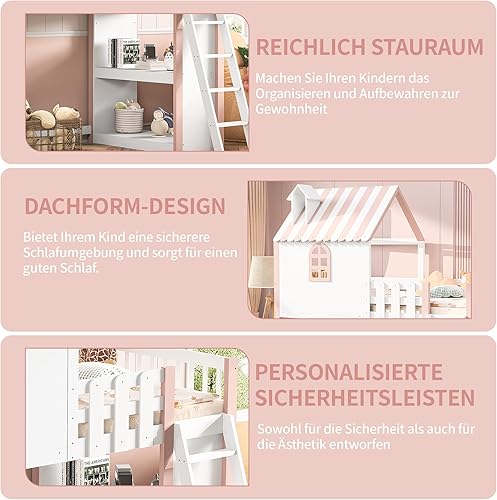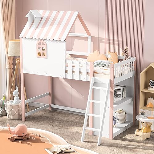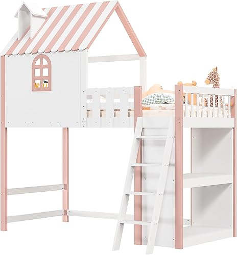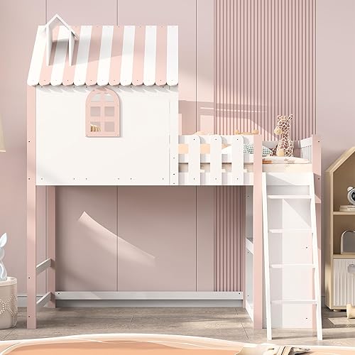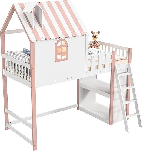 LLODERY Lit pour enfant en forme de maison 90 x 200 cm avec bibliothèque, lit mezzanine avec échelle et protection anti-chute. Lit de maison/jolie fille avec sommier à lattes. Lit en bois massif, rose
