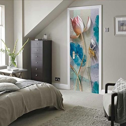 Stickers Porte Fleurs Bleues Dorées Autocollants de Décoration pour Porte Poster pour Porte PVC Stickers Porte Placard Amovible Poster Porte Imperméable Stickers de Porte Auto Adhésif 77x200cm