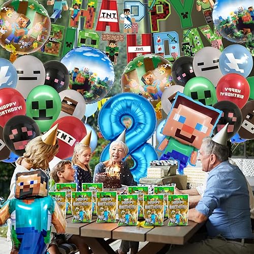 Fizdoqg Miner Gamer Kit de décoration d'anniversaire pour garçon de 8 ans avec bannière de ballons en aluminium et sacs cadeaux pour anniversaire d'enfant