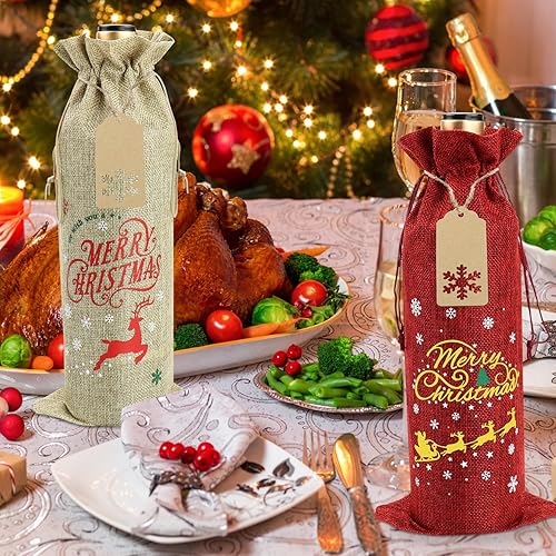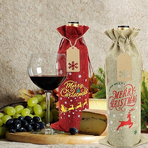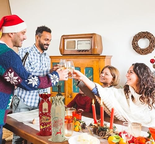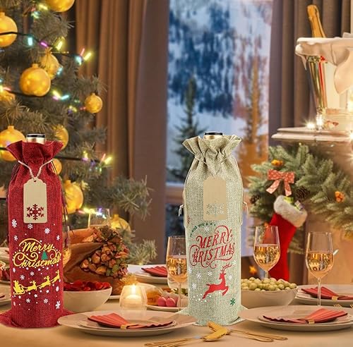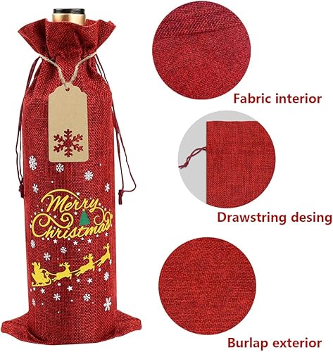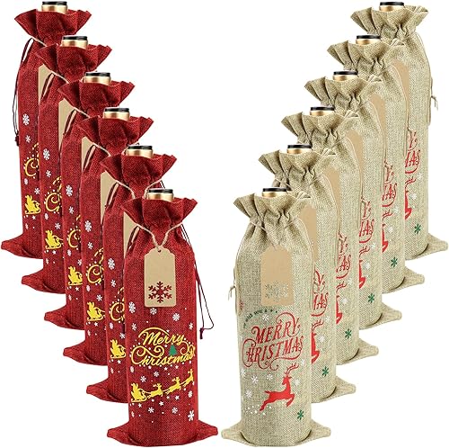 PIXHOTUL Sacs à Vin en Toile de Jute, 12 Sacs à Vin en Toile de Jute Imprimés de Motifs de Noël, avec étiquettes et Cordes pour Noël, Mariage, Voyage, Anniversaire, Fête de Noël