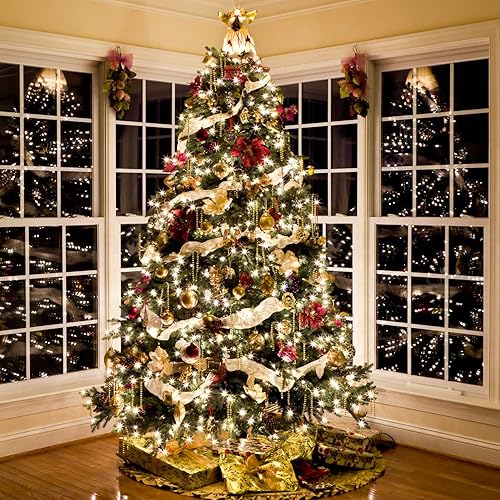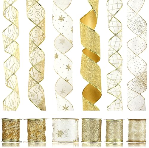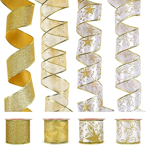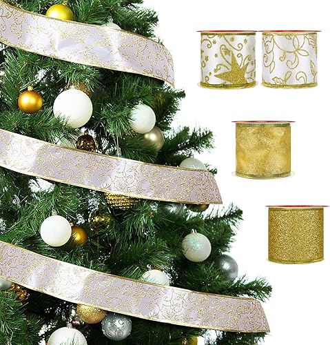 LIHAO 4 Rouleaux de Ruban de Noël, Runban de Soie Pailleté pour Décoration de Sapin de Noël, Fête de Mariage, Emballage de Cadeau (600×6.3CM, 4 Motifs)