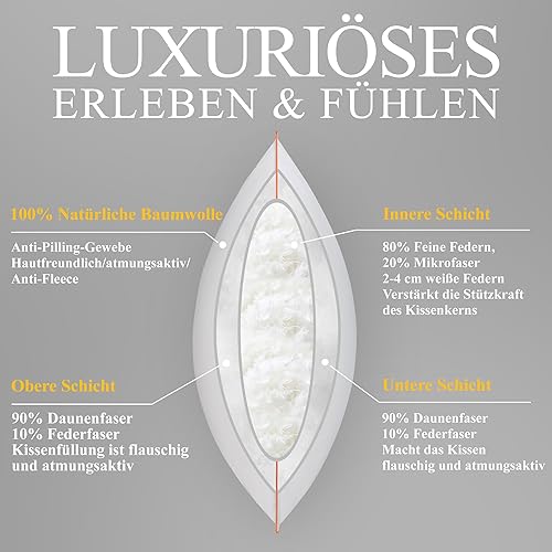 Orange Wave Oreiller en duvet, 60 x 60 cm, en plumes, RDS et Oeko-Tex, pour dormir sur le côté pour un soutien maximal et un confort de sommeil luxueux