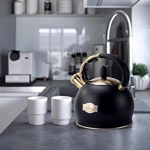 SUSTEAS Bouilloire sifflante en acier inoxydable pour cuisinière, bouilloire theiere à induction avec poignée ergonomique, 1 gant en silicone inclus, 2,6 litres (noir)