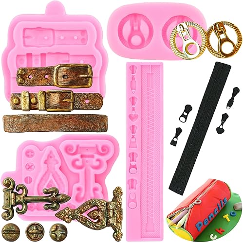 RFGHAC Vis De Charnière De Ceinture Moules En Silicone Vêtements Fermeture À Glissière Chaîne Fondant Moule Pour La Décoration De Gâteaux Bonbons Chocolat Pâte De Gomme Argile Polymère Ensemble De 4