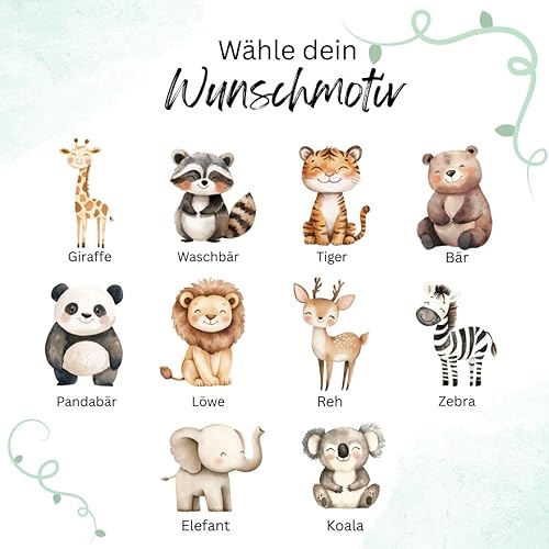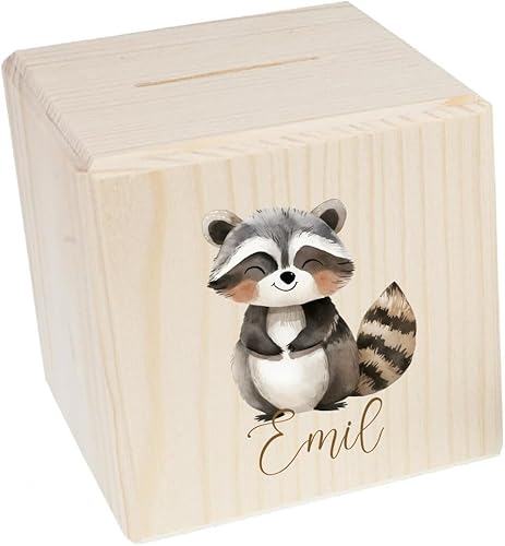 minimutz Tirelire en bois pour enfant - Personnalisable - Animal fille et garçon - 10 x 10 cm - Impression colorée raton laveur