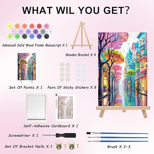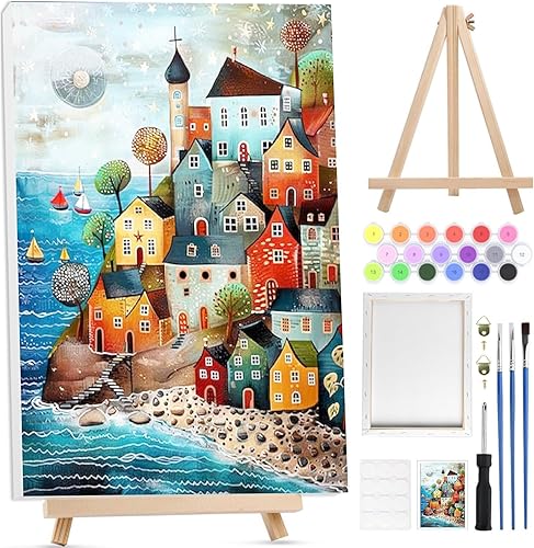 Bowetile Village Peinture par Numéros pour Adultes Avec Cadre, Kit Peinture par Numéros pour Adultes Débutants Kit Toile avec Chevalet en Bois, DIY Peinture Acrylique pour Décoration 20x30cm