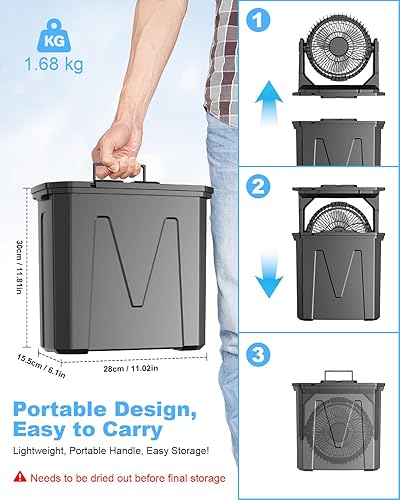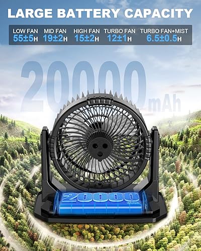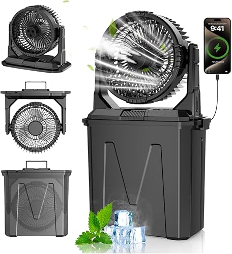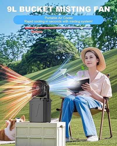 Ventilateur Brumisateur avec Seau de 9L, Batterie 20000mAh, 4 Vitesses & 4 Modes de Brume, Ventilateur Humidificateur Portable, Silencieux, Idéal pour Camping, Pêche & Voyages