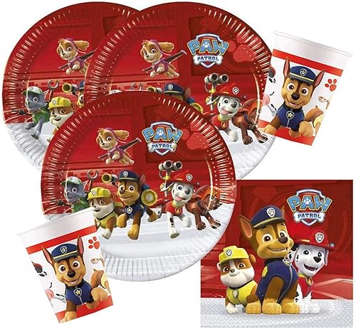 Procos 10118266 Set de fête Paw Patrol 52 pièces, 16 assiettes, 16 tasses et 20 serviettes, vaisselle jetable, décoration de table, héros sur 4 pattes