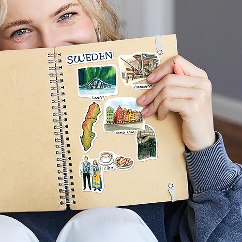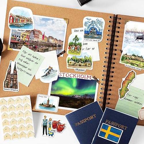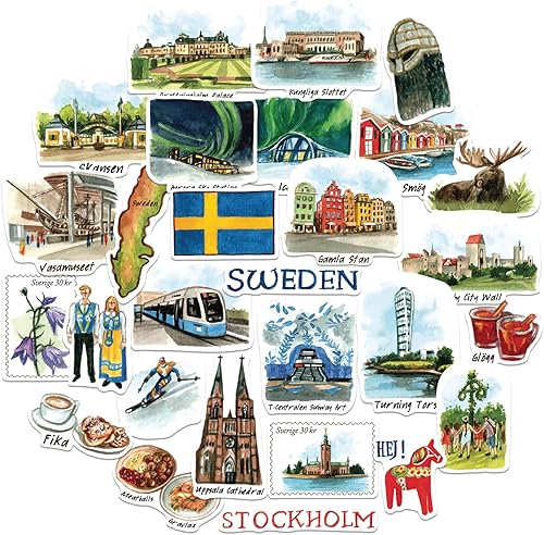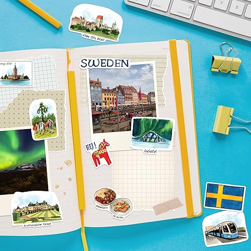 Navy Peony Autocollants de Voyage Élégants Suède (28 pièces) - Aquarelle, Scandinavie, Décalcomanies à Thème Suédois pour Journaux, Albums, Bagages, Gobelets