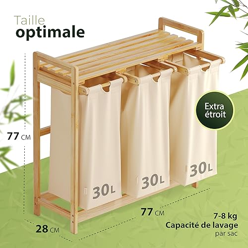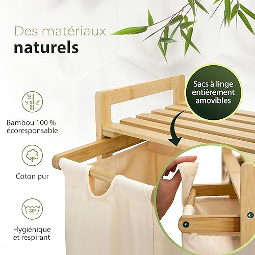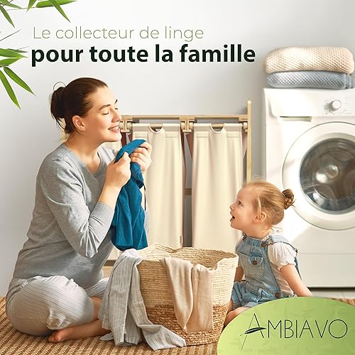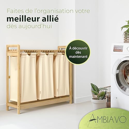 AMBIAVO Panier à Linge 3 Compartiments en Bambou et Coton Beige – Bac à Linge 3 Compartiment et Panier Linge Sale 3 Compartiment avec Sacs Amovibles – Tri Pratique et Éco pour Salle de Bain