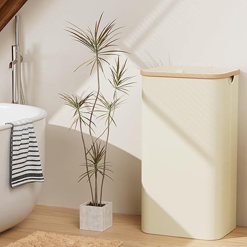 YOUDENOVA Panier à linge, avec couvercle, 100 l, étroit, sac à linge, pliable, avec poignée en plastique, haut, beige