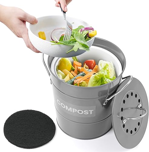 Winter Shore Composteur Cuisine Gris 4 l - Seau Compost Cuisine Anti-Odeurs avec Couvercle - Extérieure en Fer Galvanisé & Poubelle Intérieure en Plastique - Filtre Charbon Extra & Étiquette Inclus