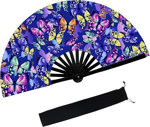 Grand Eventail de Rave, Éventail Pliable UV Glow, Clack Fan avec Pochette, Motif Papillon Evantail en Bambou, pour Festival de Musique, EDM, Drag Queen, Discothèque, Rave