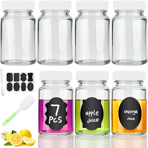 Lot de 7 petites bouteilles en verre de 60 ml à remplir avec couvercle, étiquettes, stylo et accessoires, mini bouteilles en verre pour gingembre, jus, smoothie, whisky, épices (blanc)