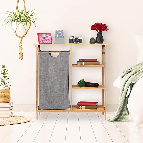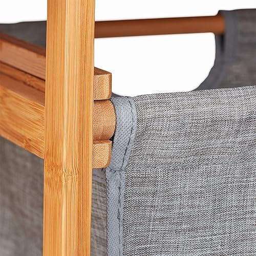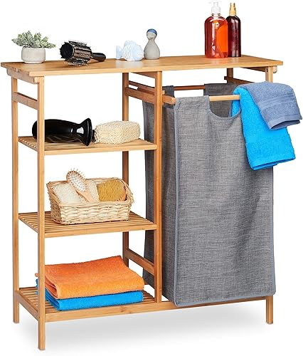 Relaxdays Etagère de Salle de Bain avec Corbeille, Bambou, 4 étages, Panier Amovible, 80,5 x 80 x 33,5 cm, Nature/Gris