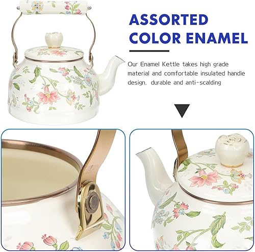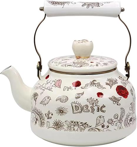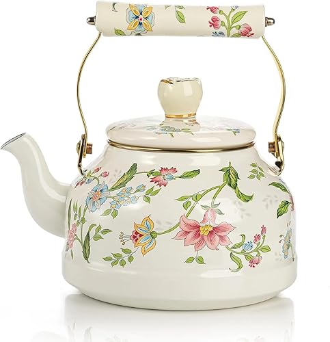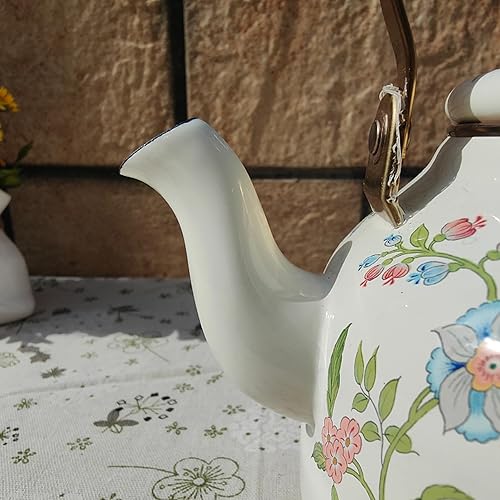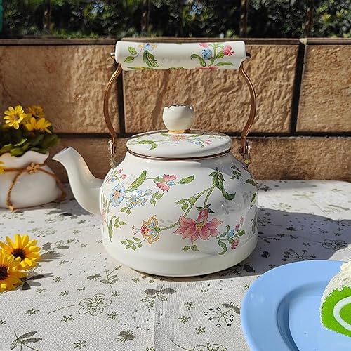 Bouilloire vintage en émail pour cuisinière, jolie théière avec perle en céramique à motif floral rose, cafetière à eau avec poignée en céramique, 2,5 L(A)