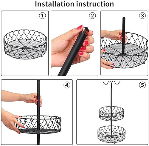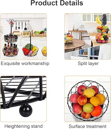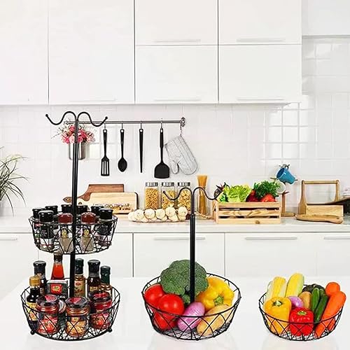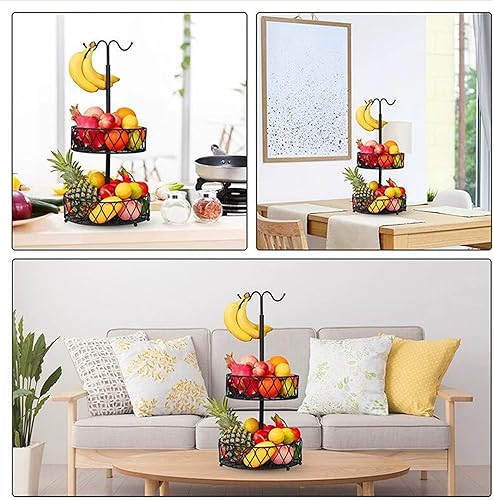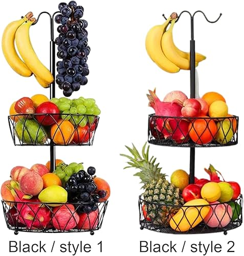 ZHDOKA Corbeille à fruits à 2 niveaux, bol à fruits en métal noir avec cintre à banane, panier à pain, support à fruits, plateau à fruits pour pain, oignons, pommes de terre