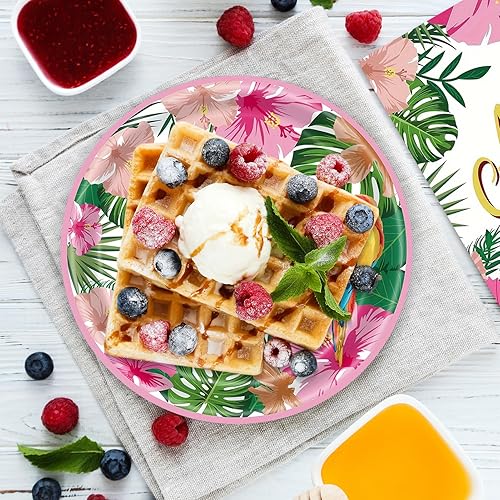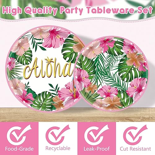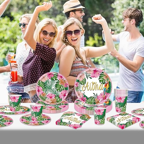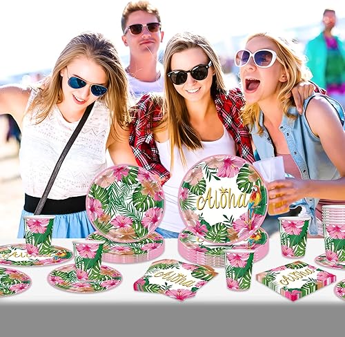 Lot de 96 pièces de vaisselle hawaïenne Aloha pour fête tropicale Luau - Décorations de feuilles de palmier - Assiettes en carton - Gobelets - Serviettes pour fête d'été sur la plage - 24 invités