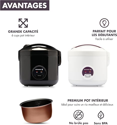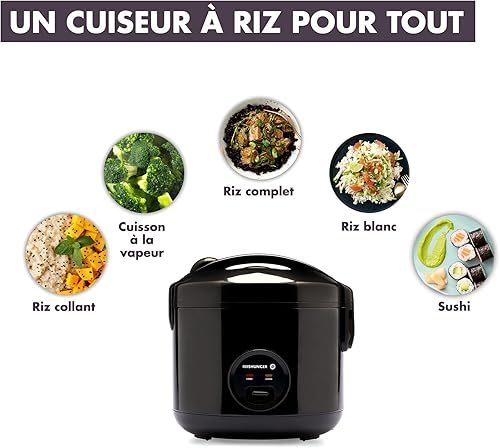 Reishunger Cuiseur à vapeur riz (rice cooker) Noir avec fonction de maintien au chaud - 1.2 l pour 1-6 personnes - Revêtement anti-adhésif avec insert