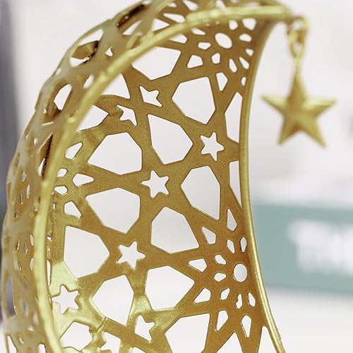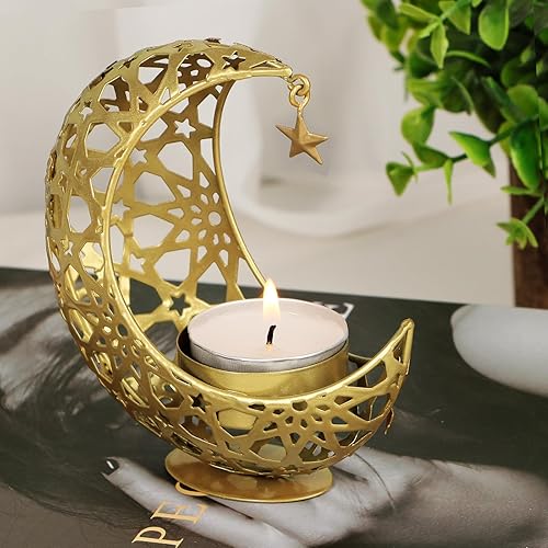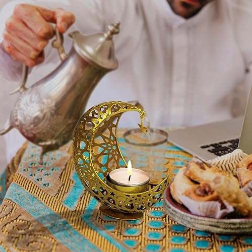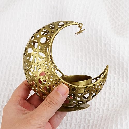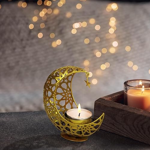 Photophore Lune Bougeoir Métal pour Eid Mubarak Noël Chandelier Support Lune Fourniture pour Bougie Décoration Ramadan Bricolage Chambre Salon Bureau Fête (Or)