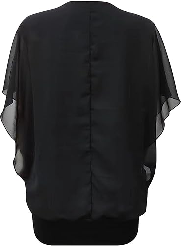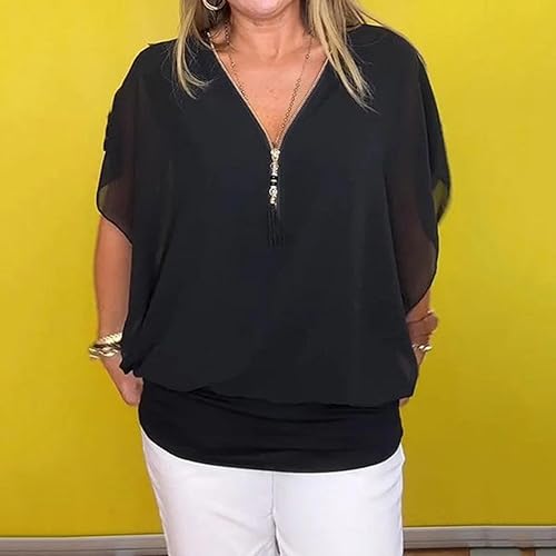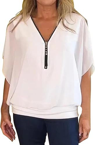 T-shirt décontracté en mousseline de soie avec col zippé et manches chauve-souris pour femme