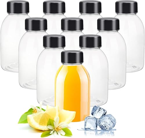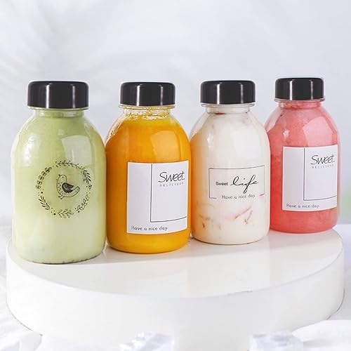 YBCPACK Lot de 12 bouteilles (250 ml) en plastique transparent avec bouchons, idéal pour l’eau, le jus, le lait, les smoothies et autres boissons faites maison.