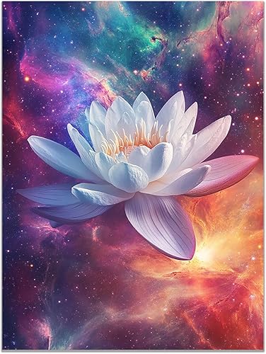 HOQIU Peinture Sur Toile Fleurs, Peinture de lotus dans le ciel étoilé, affiche murale, deco mural, Pour la maison, le bureau, la chambre(blanc)-40x60cm Encadrée