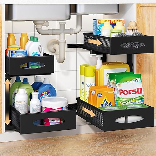 Hanured® 2 Pièce Rangement sous Évier, Organisateur sous evier Cuisine à 2 étages, Tiroir Etagère de Rangement coulissante Hauteur réglable, Noir