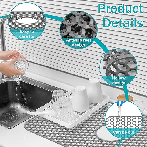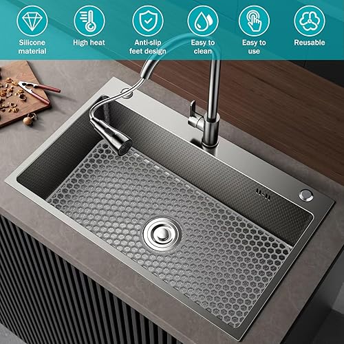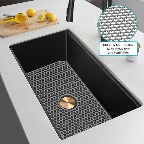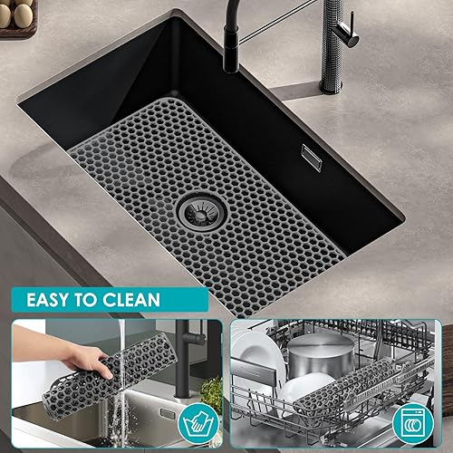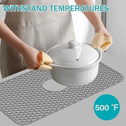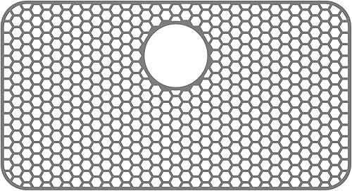 Tapis de protection d'évier en silicone 66,2 x 35,6 cm avec trou de drainage central, antidérapant et résistant à la température, tapis d'évier pour fond d'évier de cuisine, vaisselle et verrerie