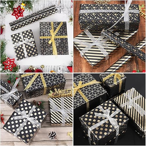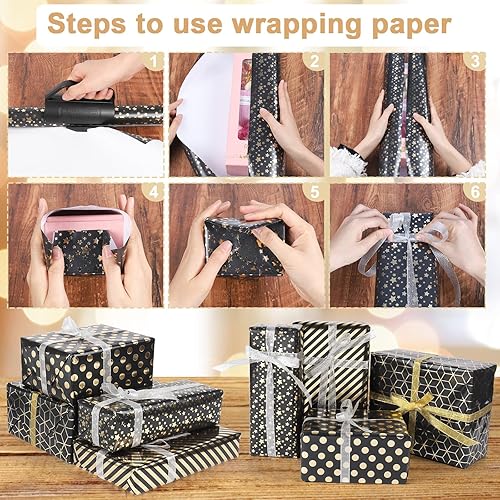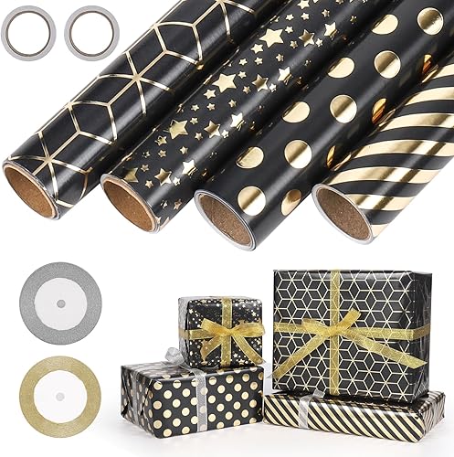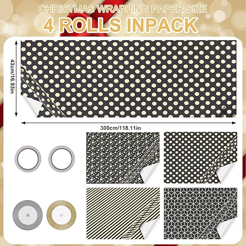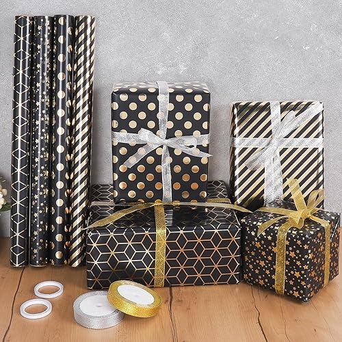 GuKKK Papier Cadeau 43cm x 3M, 4 Rouleaux De Papier d'emballage Cadeau et 2 Rouleaux de Ruban, Papier Cadeau Rouleau Anniversaire, pour Anniversaire, Noël, Vacances, Mariage, Cadeau de Naissance