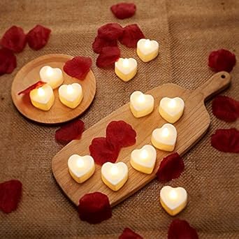 Mudder 12 Pièces LED Bougies Chauffe-Plat Forme de Cœur LED Bougies d’Amour avec 200 Pétales de Rose en Soie Fausses Pétales de Dispersion pour Saint-Valentin (Lumière Jaune, Pétale Rouge Foncé)