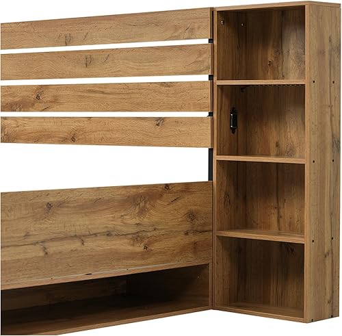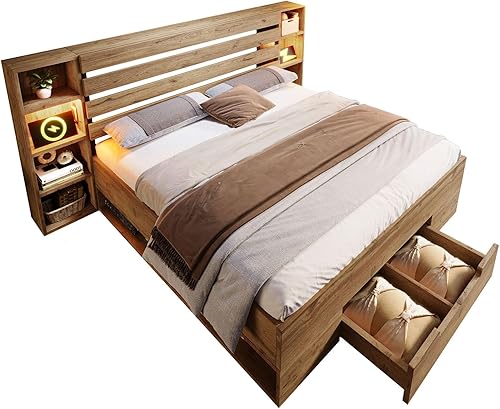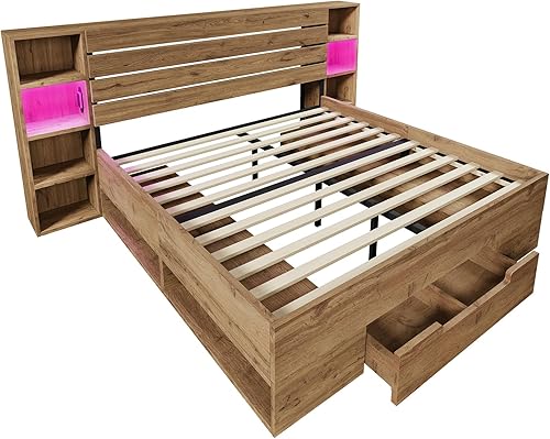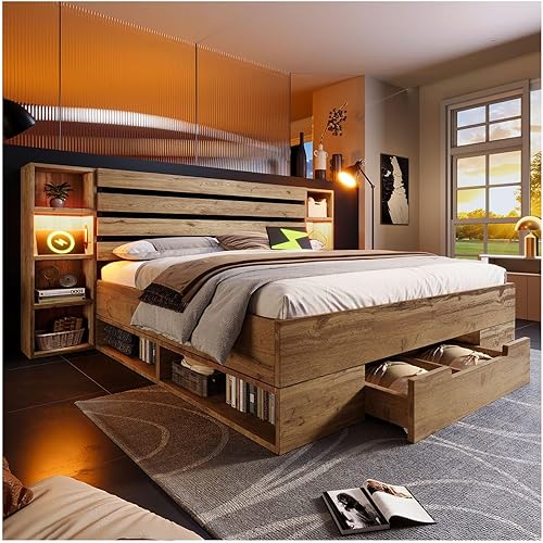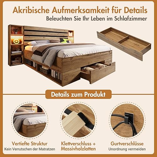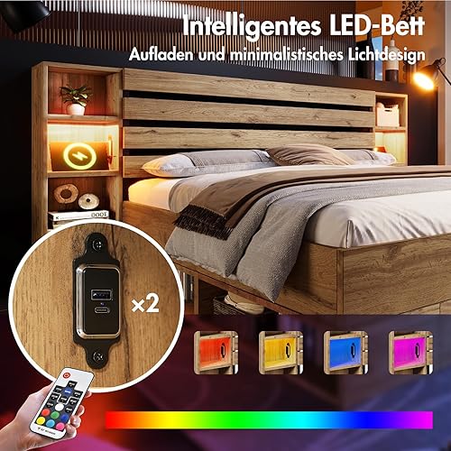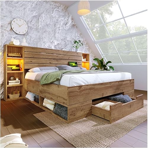 Lit double en bois massif 180 x 200 cm, espace de rangement, avec éclairage LED et espace de rangement USB C, tête de lit et tiroirs, cadre de lit en bois, chêne (sans matelas)