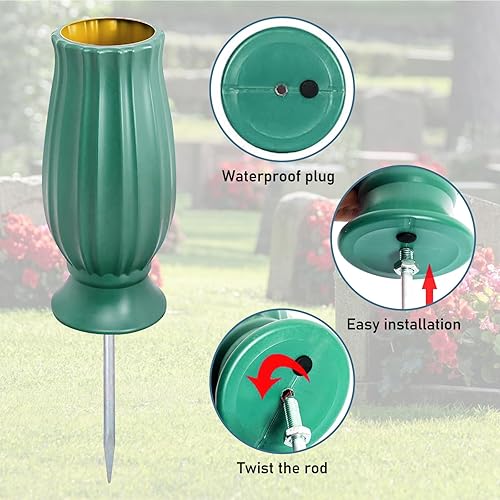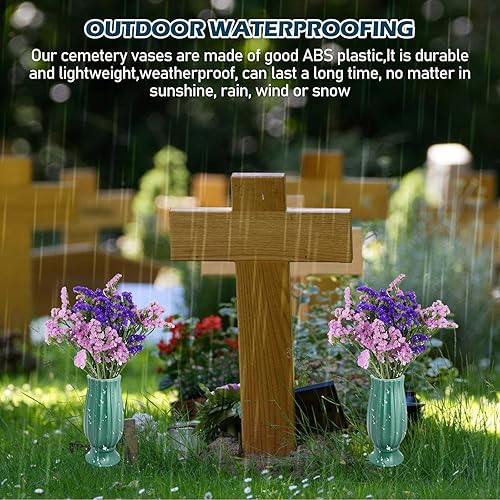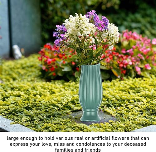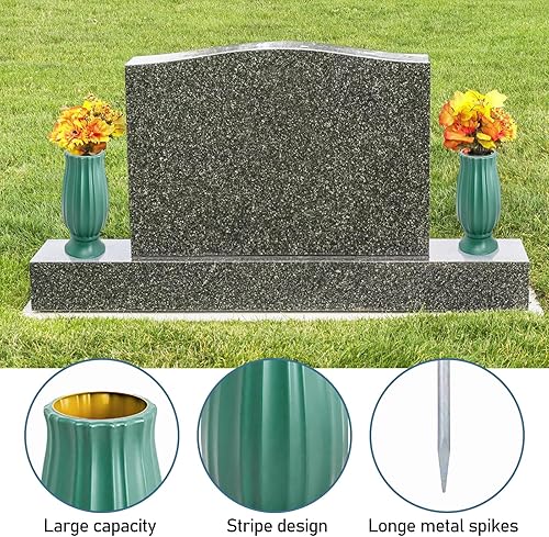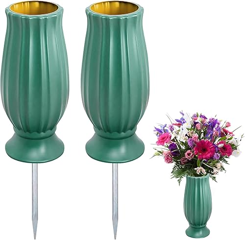 Lot de 2 vases funéraires en plastique avec piquet de terre - Pour cimetière - Résistant au gel - Avec pointes en métal - Pour la réception de bouquets de fleurs - Vert