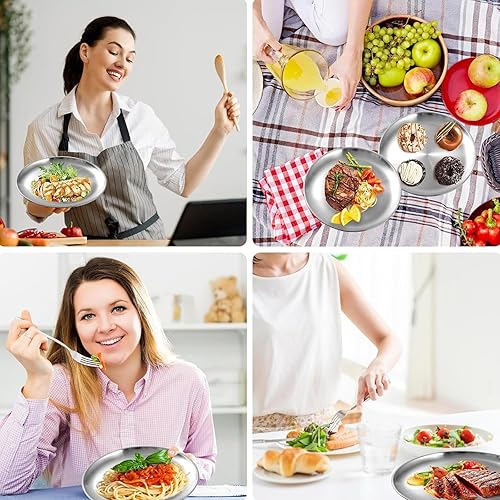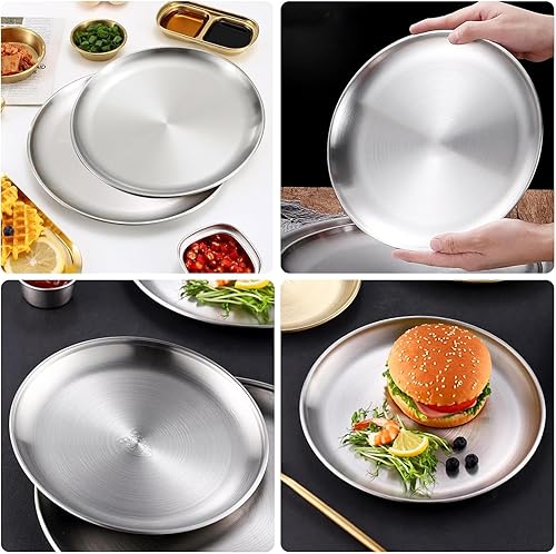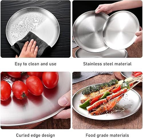 LEKEFETO Lot de 4 assiettes rondes en acier inoxydable - Diamètre : 20 cm et 23 cm - Assiettes de camping solides - Pour camping, pique-nique, randonnée, cuisine