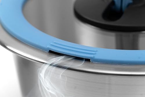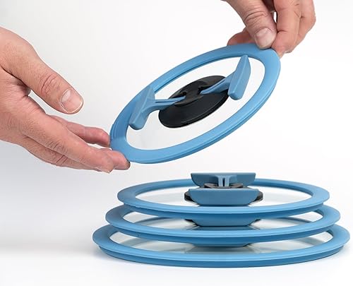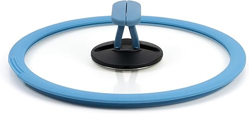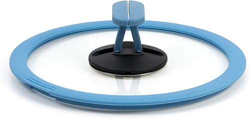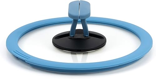 cookvision Couvercle en verre avec bord en silicone, verre incassable, sortie de vapeur latérale, peu encombrant grâce aux poignées rabattables, bleu (diamètre 22 cm)
