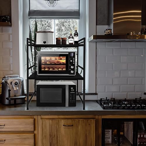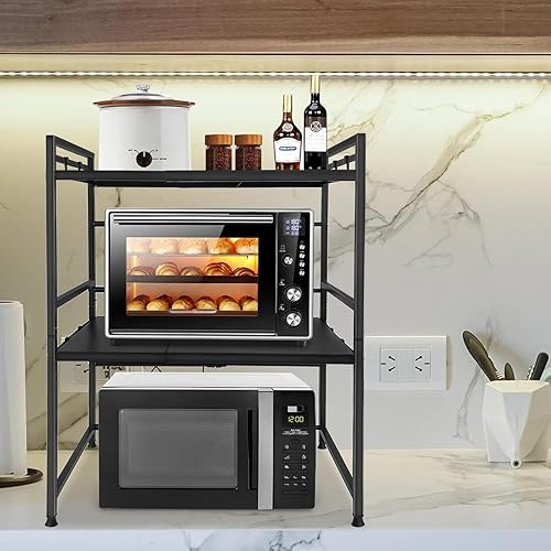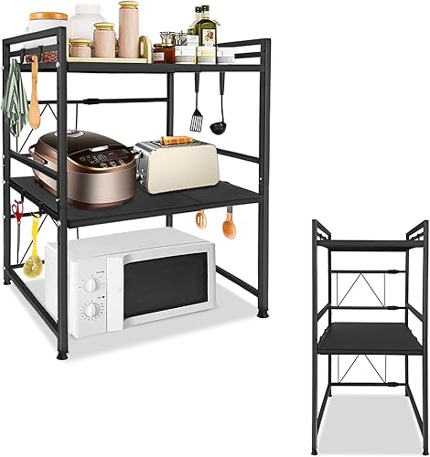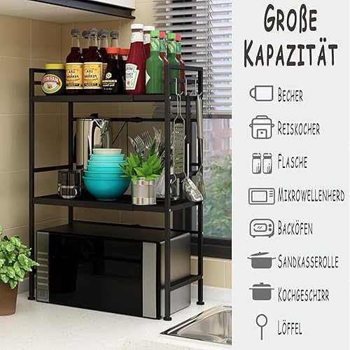 TANYEAR Étagère extensible pour micro-ondes à 3 niveaux - Support pour micro-ondes - Organiseur de cuisine avec 8 crochets - Organiseur de rangement à suspendre - Étagère de boulangerie pour le