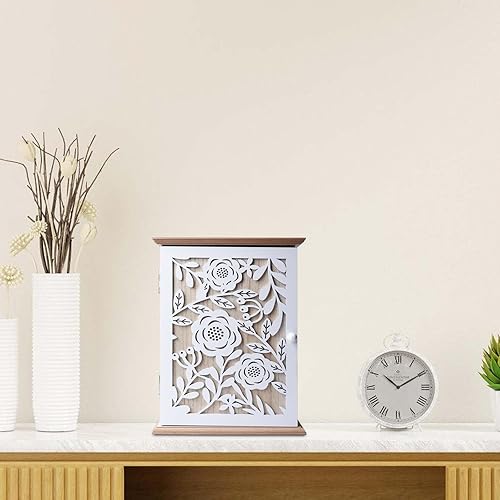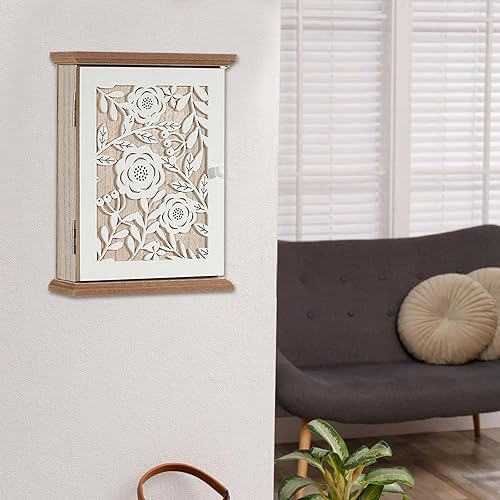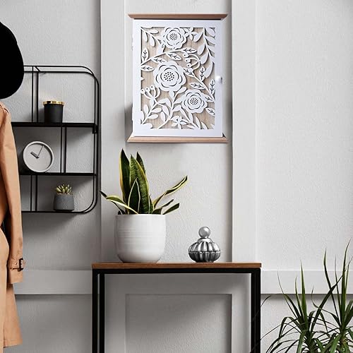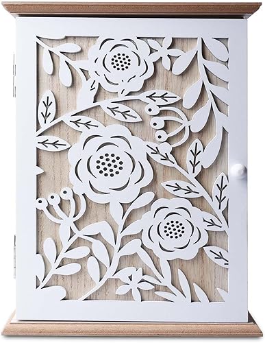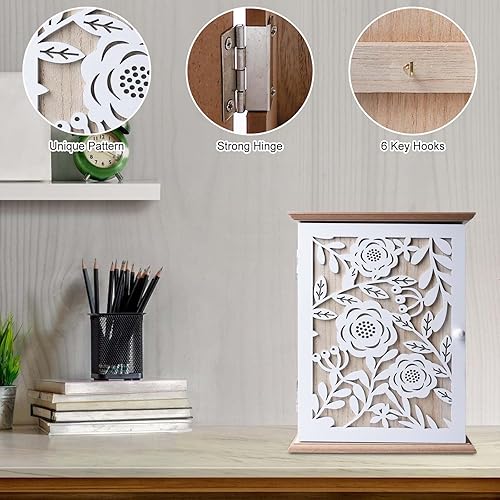 GOMETY Armoire à clés en bois avec 6 crochets - Boîte à clés avec motif creux rose - Organiseur mural pour entrée, couloir, bureau - Blanc