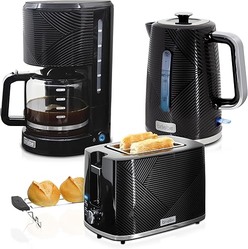 briebe Elegance Ensemble Grille Pain 2 Fentes Tranches Larges + Bouilloire Électrique 1,7 L, 2200W, sans BPA + Cafetière Filtre 10 Tasses, Pack Petit Déjeuner Électroménager, Design Moderne, Noir