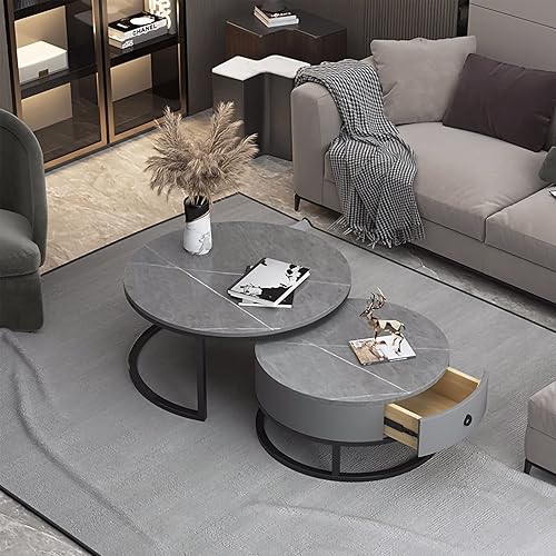 Ensemble de 2 tables basses gigognes rondes, ensemble de tables gigognes 2 en 1, avec tiroir de rangement, structure en métal à texture de marbre ardoise, table à thé pour la décoration de meubles