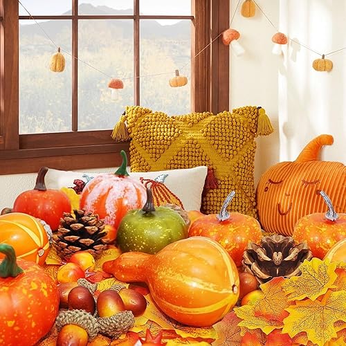 Lot de 96 Citrouilles Artificielles Décoratives, Décoration de Citrouilles Automne, Mini Citrouille Artificielle Maple Leaves Cônes De Pin Acorns, pour Thanksgiving, Halloween