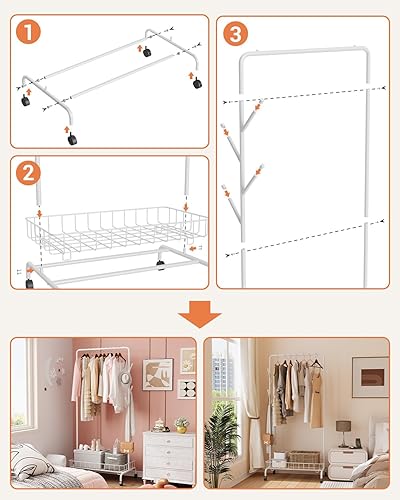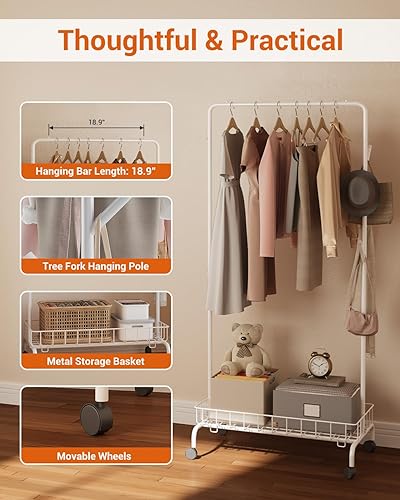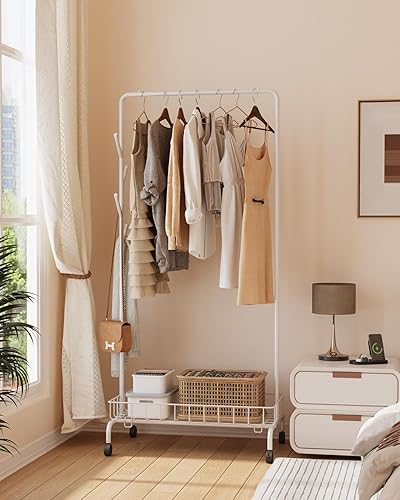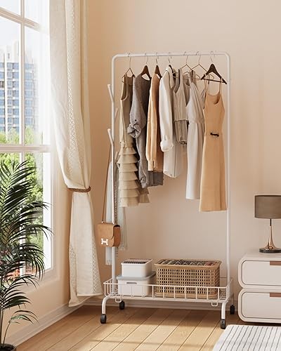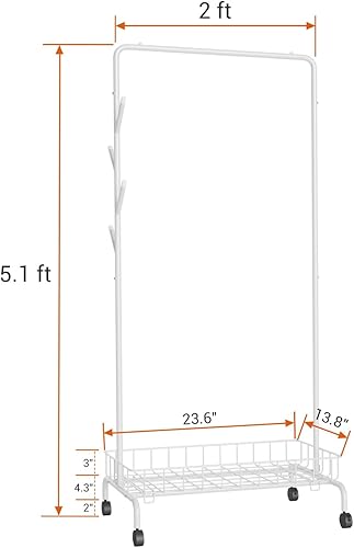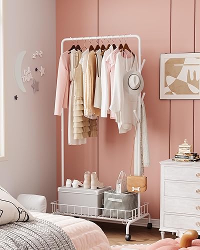 Salutmeuble Portant à vêtements réglable avec étagère en maille métallique et roulettes - crochets de suspension portables, organiseur à fond blanc pour le rangement des vêtements et de la maison