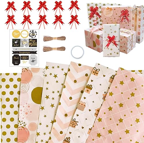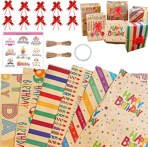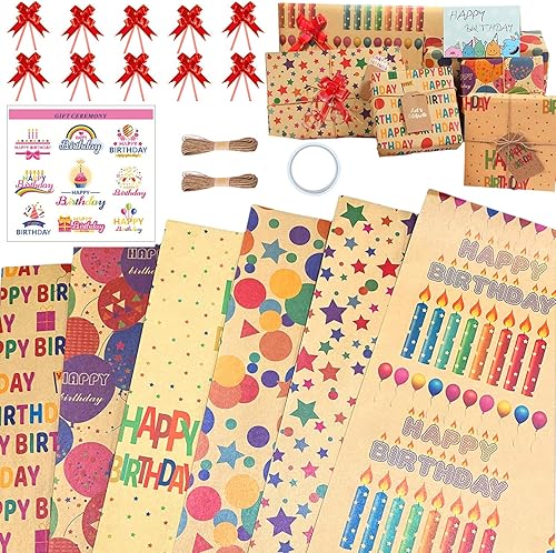 Papier Cadeau Anniversaire d'emballage avec Étiqueter et Ficelle Kraft Recyclable Papier Cadeau Feuille Wrapping Paper Happy Birthday Enfant Garçon Fille Femme Homme