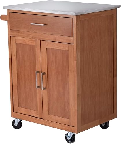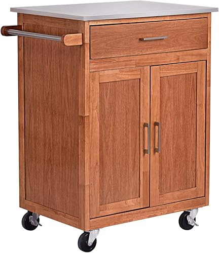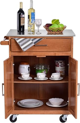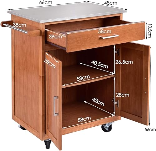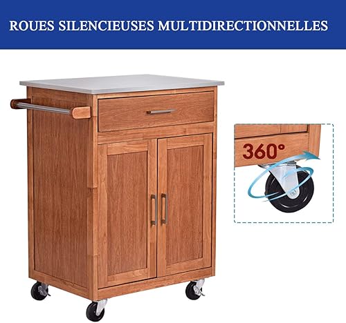 COSTWAY Desserte de Cuisine à roulettes avec Frein, Chariot de Cuisine Dessus de Table en Acier Inoxydable, Rangement Cuisine Tiroir Large, 2 Portes 72x48x89cm Naturel